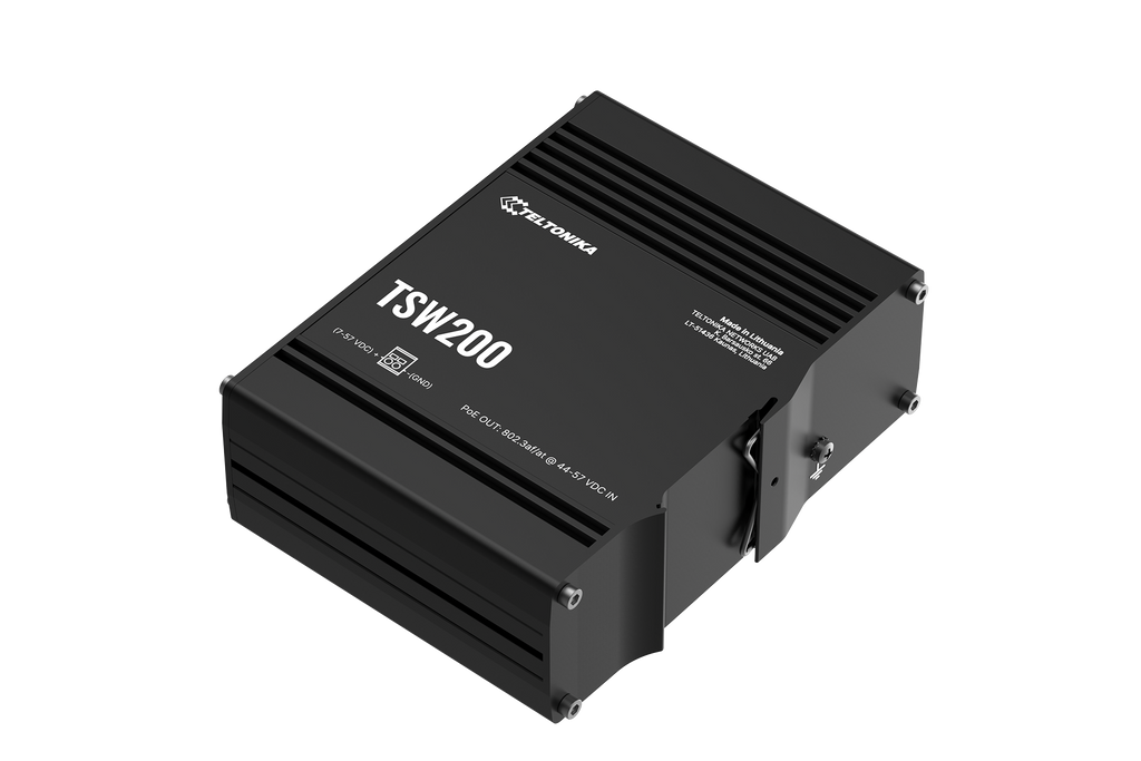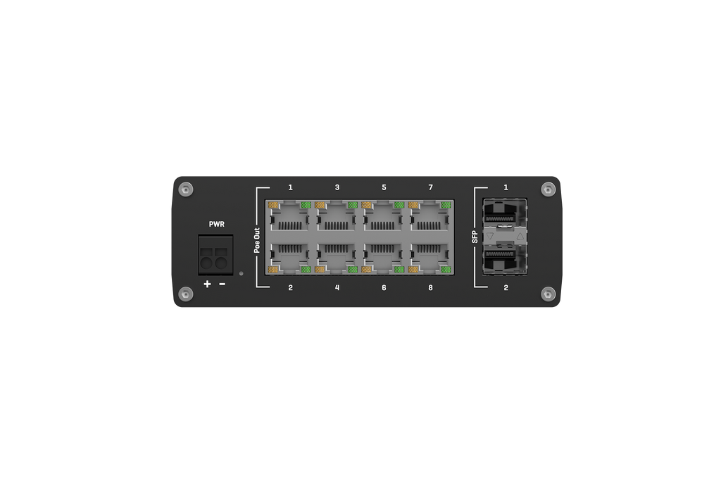 TSW200 is an industrial Ethernet switch with 2 SFP ports for long-range Fiber-optic communication and 8 Gigabit Ethernet ports that support IEEE802.af and IEE802.3at Power-over-Ethernet standards. Classified as power source equipment (PSE), it enables the centralization of the power supply, providing up to 30 watts per port and reducing the effort to install power.
