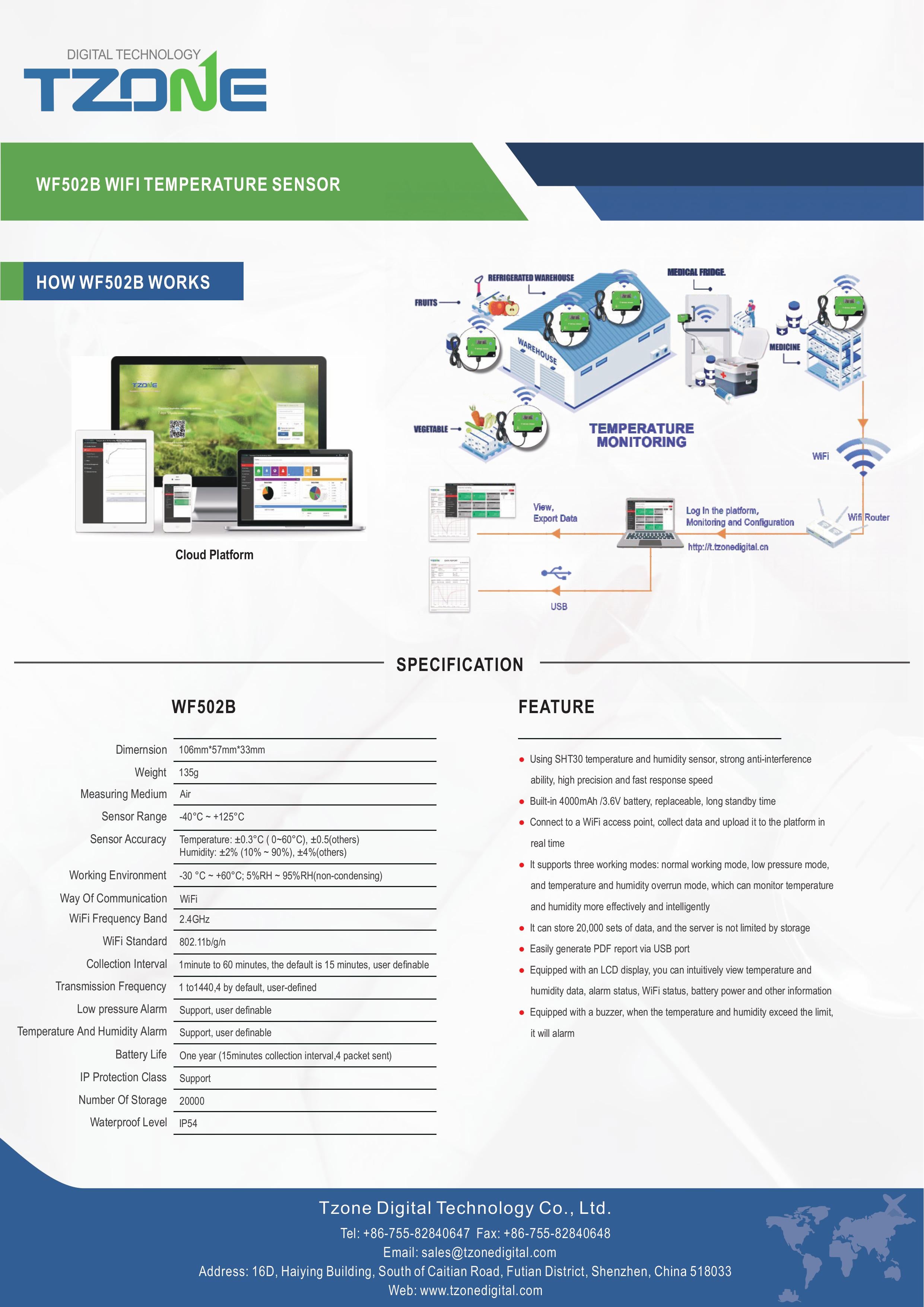 3. 20,000 temperature and humidity recordings can be stored into device flash memory, and unlimited reccordings storage on cloud based platform