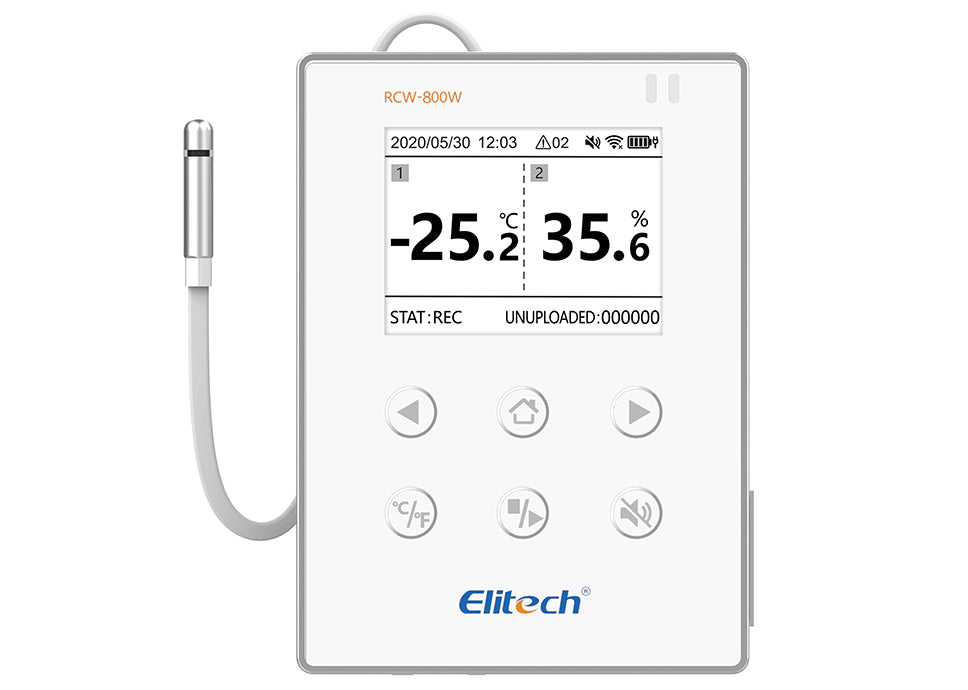 RCW-800W series is an IoT recorder that communicates through WIFI network, which is used for real-time monitoring, recording, alarming and data uploading of ambient temperature/humidity. The recorder is mainly composed of a temperature/humidity sensor and a host instrument. It directly transmits the measured value to the Elitech cold cloud through the Wi-Fi network. It can be stored in the Elitech cold anytime, anywhere through mobile phones and PCs with Internet access functions. View and analyze the data in the cloud platform. After the limit is exceeded, the alarm can be sent in time through SMS, email, voice and other methods.