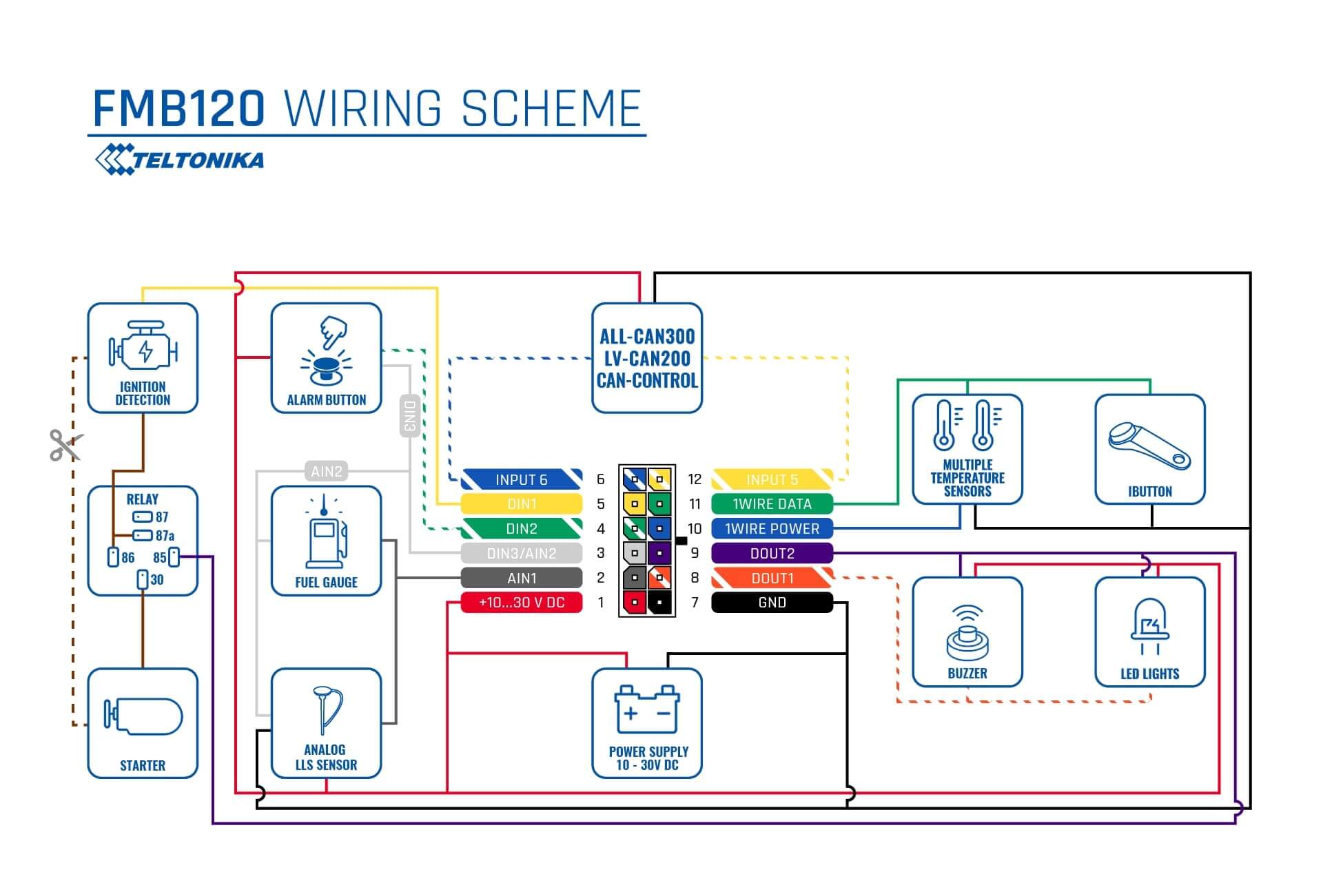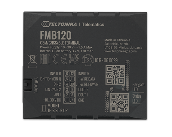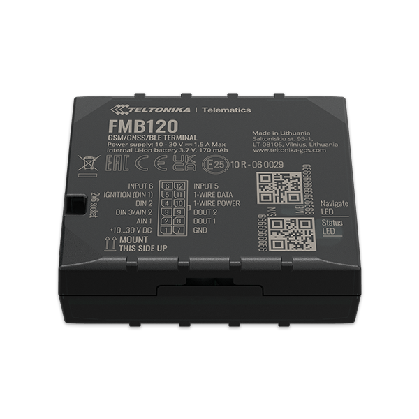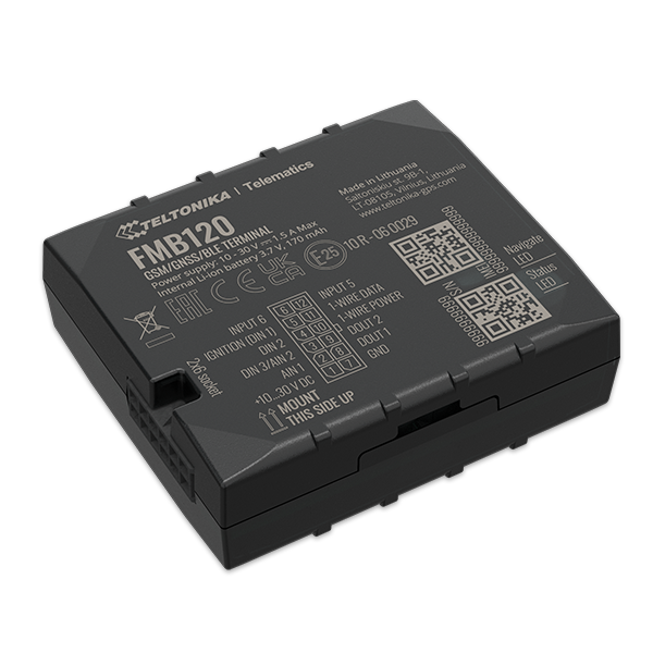 FMB120 small and professional tracker with internal high gain GSM and GNSS antennas, which is able to collect device coordinates and other useful data and transfer them via GSM network to server. This device is perfectly suitable for applications where location acquirement of remote objects is needed: fleet management, car rental companies, taxi companies, public transport, logistics companies, personal cars and so on. FMB120 can perform tasks on remote objects, such as monitoring engine status, controlling truck’s door etc.