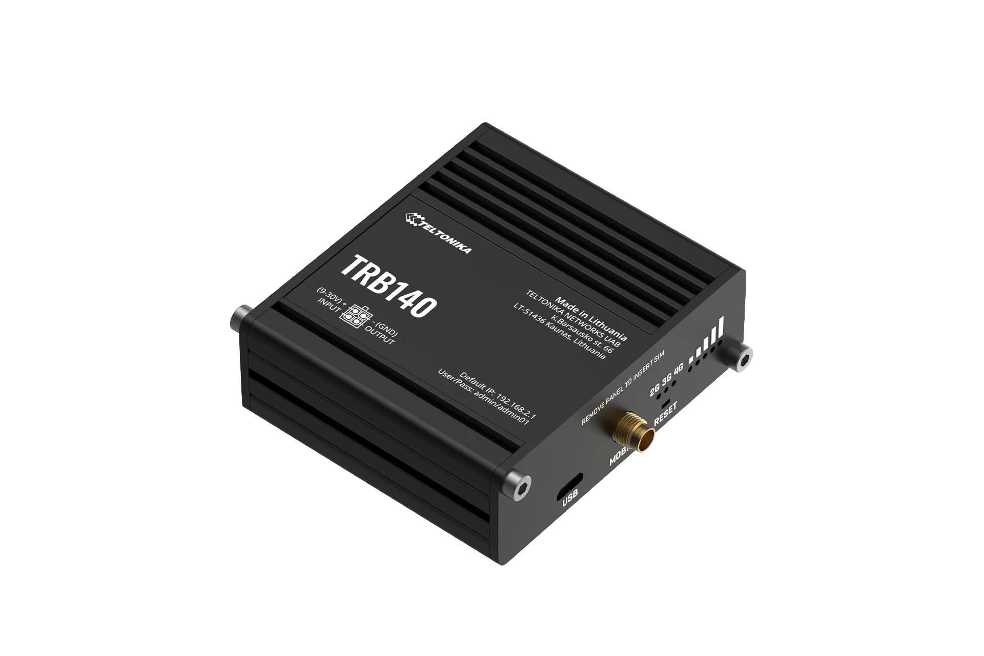 TRB140 is an ultra-small, lightweight, and energy-efficient industrial gateway equipped with mission-critical LTE Cat 4 capabilities, Gigabit Ethernet interface, digital Inputs/Outputs, and micro-USB port.