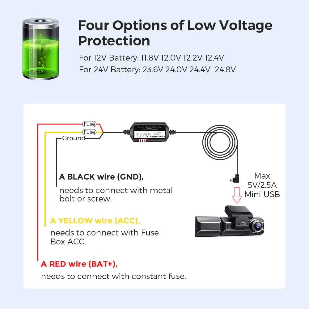 • AZDOME 3-Lead ACC Mini-USB Port Hardwire Kit - This allows the Dash Cam to be installed in your vehicle without the need to use the 12V/24V outlet (car cigarette socket). Converts 12V-24V to Output 5V/2.5A Max.