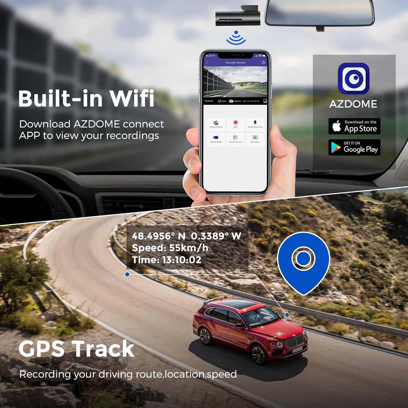 The videos/pictures can be viewed and downloaded to the smartphone through the dash cam's Wi-Fi and AZDOME App, No need to take out the TF card to check on the computer.
